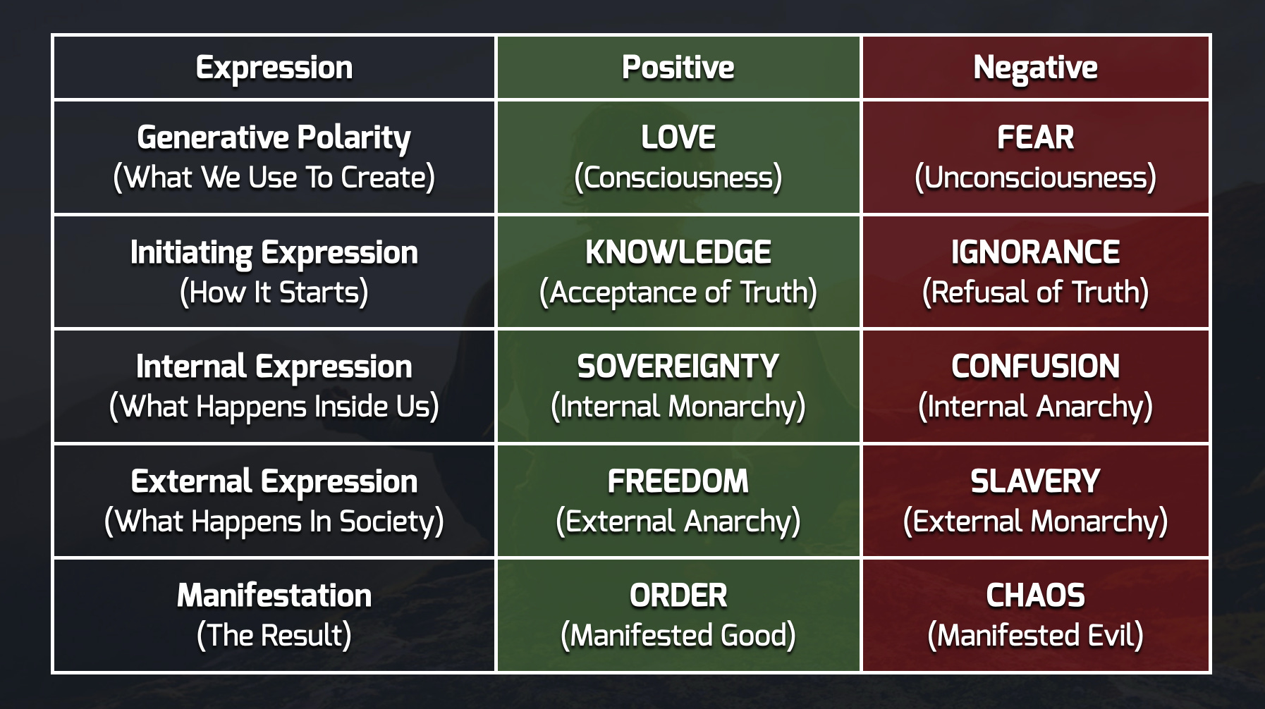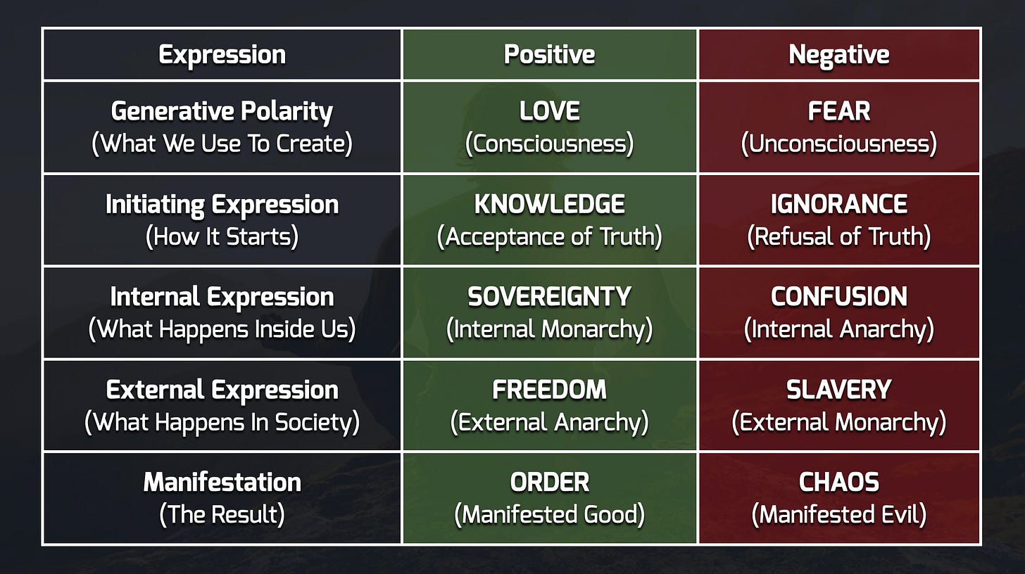 Good is the side of Love. It is virtue and principle, sovereignty, objective morality, order, and truth. Evil is the side of Fear. It is pure egoic self-preservation (at the expense of other people’s rights and freedom), control, moral relativism, chaos and deception. Good is about Freedom (anarchy) and Evolution. Evil is about Slavery (statism) and Involution. There is no grey area between them. There is no valid “good ends justify the bad means” reasoning. It’s either one or the other.