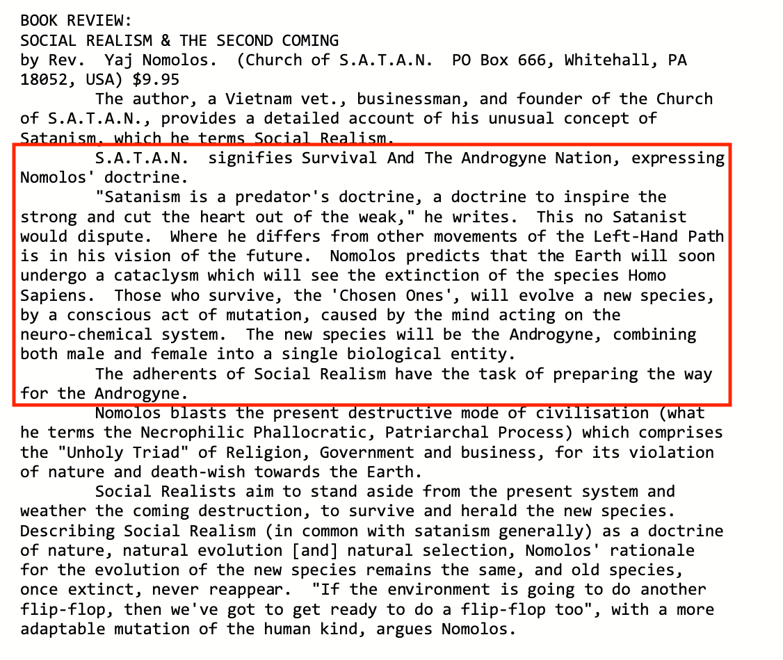 One of the topics of this video is the eugenics agenda and its connection to Satanism. Part of that agenda is Neo-Feminism and Transgenderism. In fact, there was a variant of the Church of Satan in Whitehall, PA founded by “Yaj Nomolos.” He released a pamphlet expressing his vision which he called “Social Realism,” which promulgated the idea of biological androgyny as the next step in human evolution: